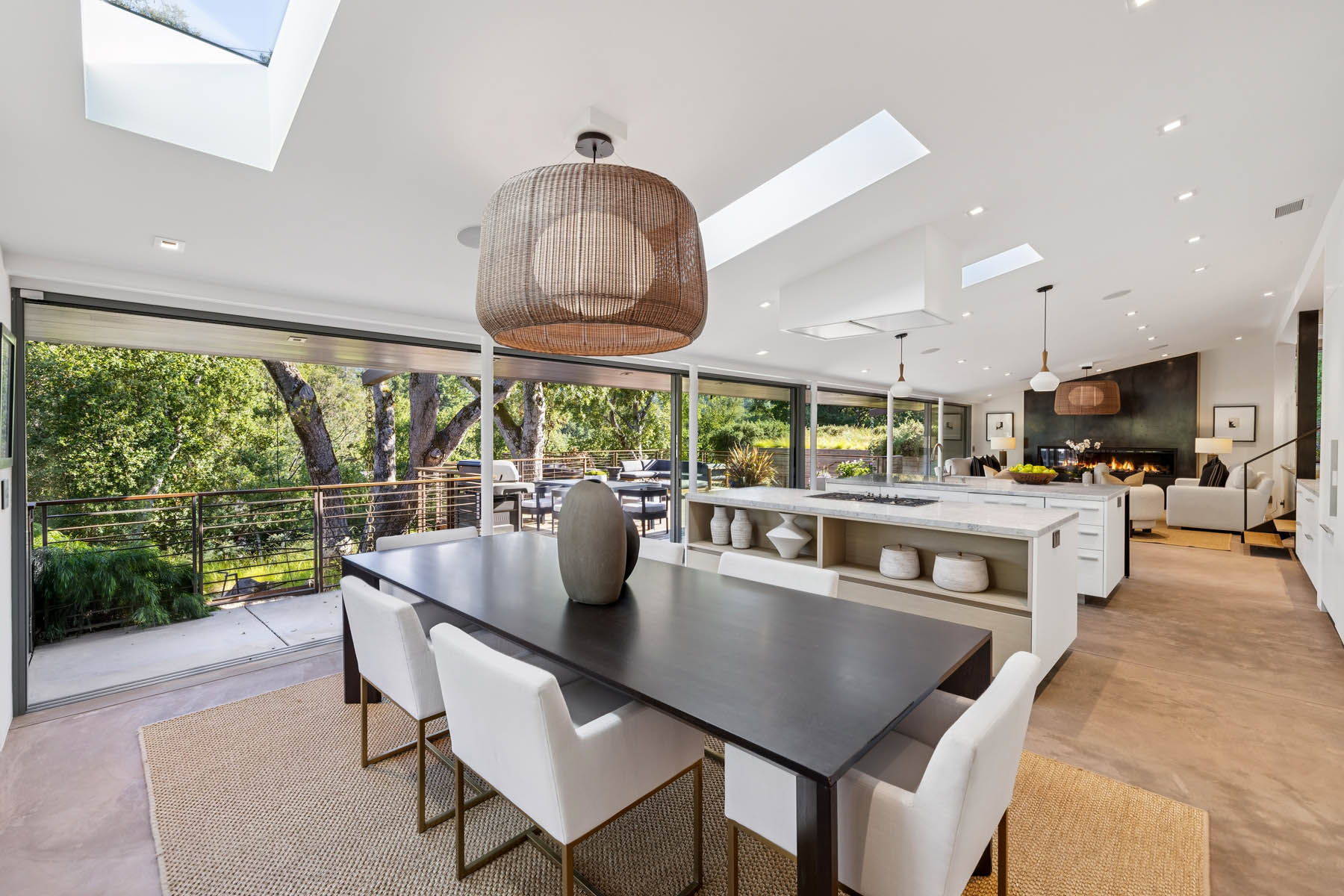 The multi-level floor plan features a luxurious primary suite with spa-inspired bath and an enormous skylit dressing room, two additional bedrooms with a shared luxe bath, and a striking hallway bath. Outdoor amenities include a solar-heated pool, spa, fire pits, crushed stone walking paths, an elevated pavilion, and expansive Ipe deck. All just minutes from trails, town conveniences, and top-rated Portola Valley schools.